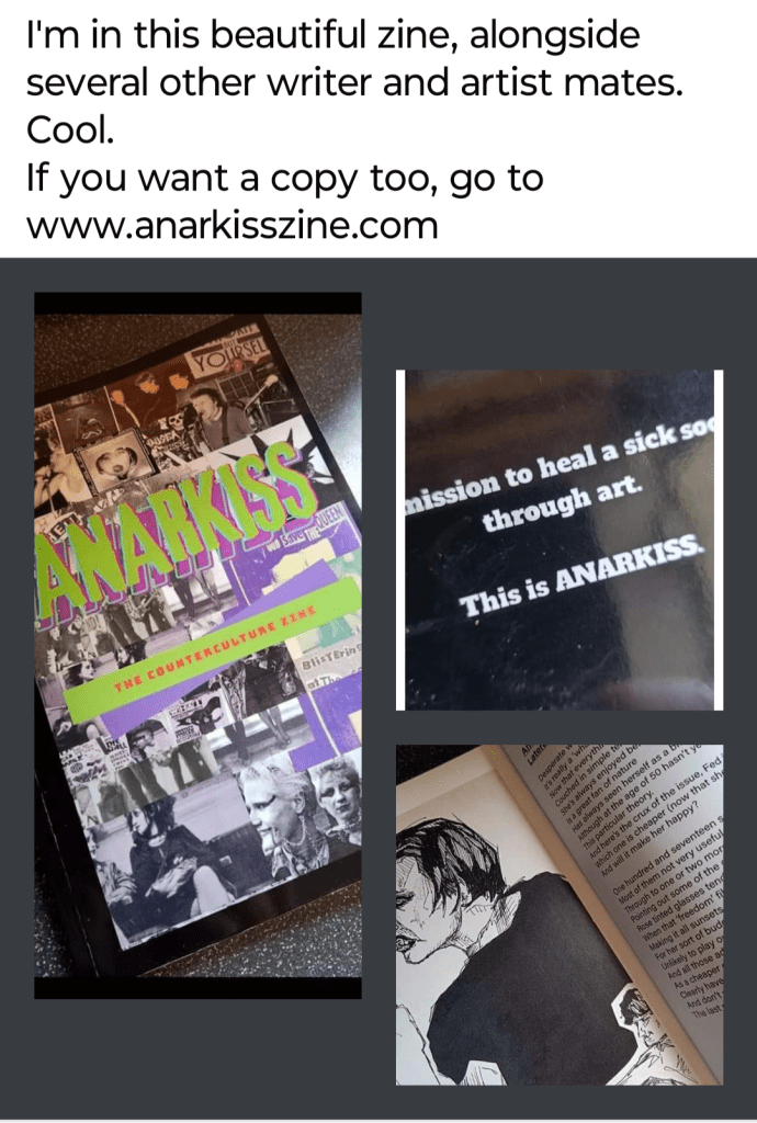 Anarkiss Zine Posted bylateralgpoet24th Jul 2024Posted inUncategorized Share this: Click to share on X (Opens in new window) X Click to share on Facebook (Opens in new window) Facebook Like Loading... Related Published by lateralgpoet Nomad, outlaw, womble. View more posts