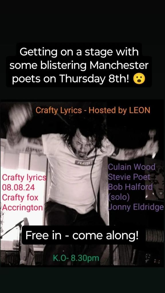 Crafty Lyrics @The Crafty Fox, Accrington, 8th August. Posted bylateralgpoet1st Aug 2024Posted inUncategorized Share this: Click to share on X (Opens in new window) X Click to share on Facebook (Opens in new window) Facebook Like Loading... Related Published by lateralgpoet Nomad, outlaw, womble. View more posts