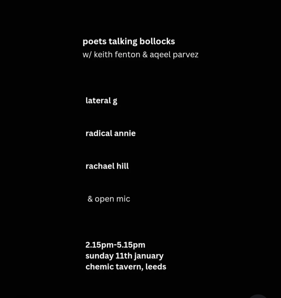 Next gig: Leeds, Jan 11th Posted bylateralgpoet2nd Jan 2026Posted inUncategorized Share this: Click to share on X (Opens in new window) X Click to share on Facebook (Opens in new window) Facebook Like Loading... Related Published by lateralgpoet Nomad, outlaw, womble. View more posts