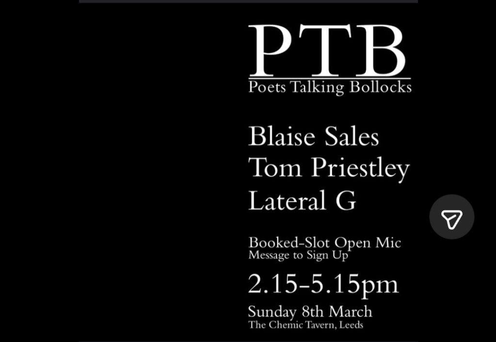 Sunday 8th March – next gig. Posted bylateralgpoet4th Mar 2026Posted inUncategorized Share this: Share on X (Opens in new window) X Share on Facebook (Opens in new window) Facebook Like Loading... Related Published by lateralgpoet Nomad, outlaw, womble. View more posts
