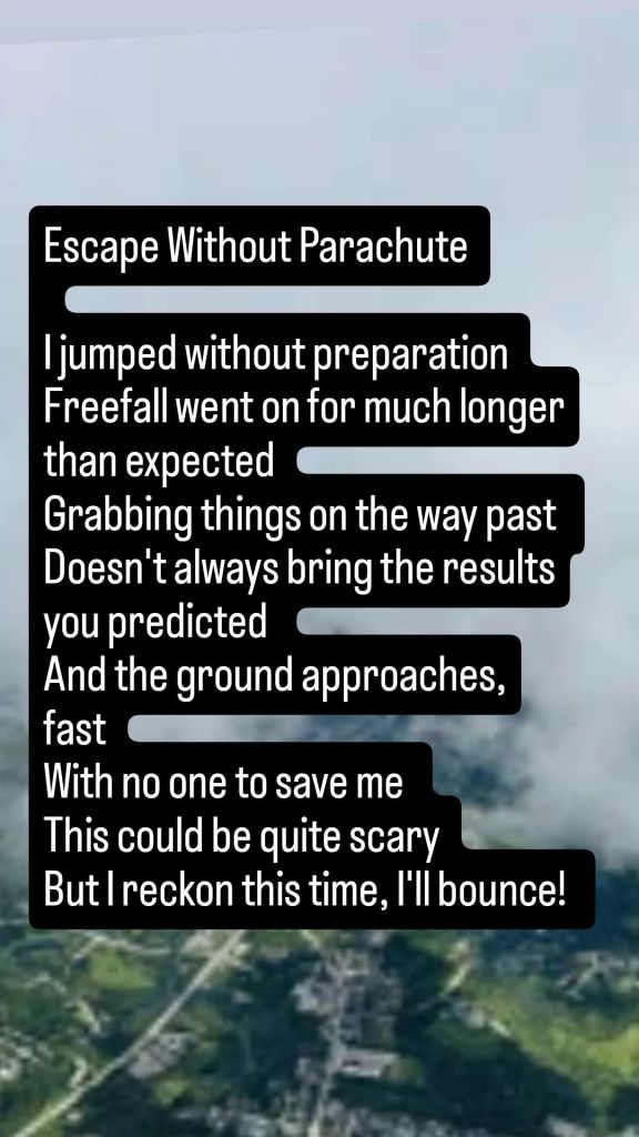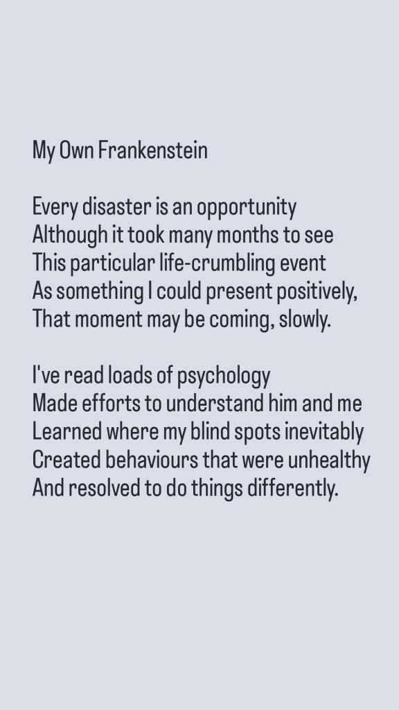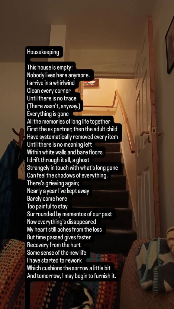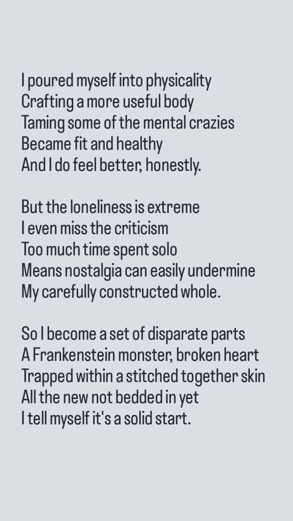 I am writing again. This makes me happy. I haven’t noticed it happening, but when I sit down and have a look in my folder, there are loads of new things sitting there. Feels back to normal. I’ll know when I am truly recovered, because I will be writing about things outside myself. I’m waiting for that. 😉